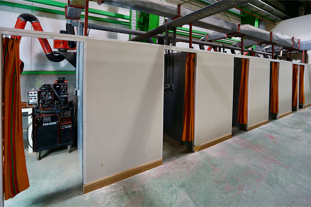 در کارگاه جوشکاری ده اتاقک وجود دارد که در هر یک از آنها جوشکار میتواند بدون تماس با دیگر اتاقکها و با اطمینان از عدم وجود خطرات از سوی جوشکار اتاق مجاور به عملیات جوشکاری بپردازد. ضمن اینکه هر اتاقک دارای سیستم تهویه مجزا بوده و بدین صورت امکان تخلیه محیط از گازهای ناشی از فرآیند جوشکاری فراهم گردیده است.